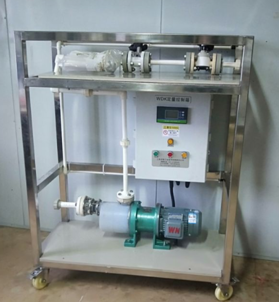 WDK氯化鈉配發(fā)料定量控制箱在單泵定量控制系統(tǒng)移動小車上的安裝使用的實物圖如下: